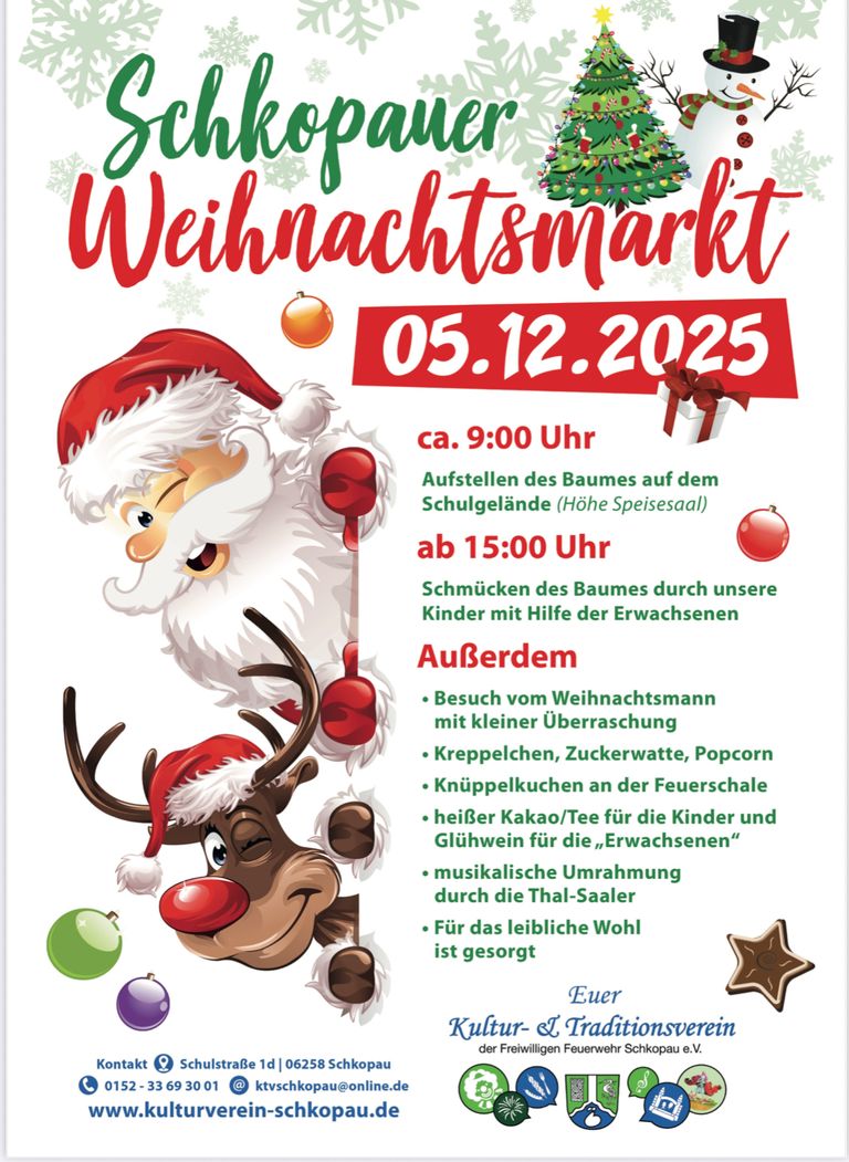 Wir laden alle Schkopauer herzlich zu unserem diesjährigen Weihnachtsmarkt ein, der wie jedes Jahr am 6. Dezember 2024 vor unserer Schülerspeise der Grundschule stattfinden wird. Freut Euch alle auf eine festliche Atmosphäre, köstliche Leckereien, handgefertigte Geschenke der Grundschule die käuflich erworben werden können und natürlich ist auch der Weihnachtsmann vor Ort und wir haben sicher die ein oder andere Überraschung dabei.